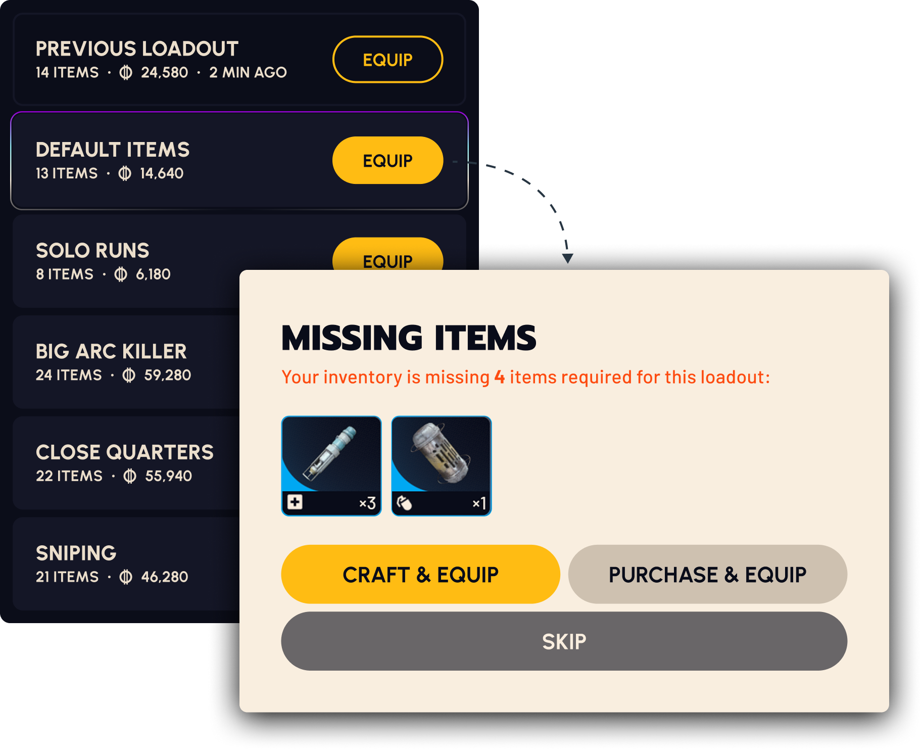 Imagine being able to equip an entire loadout with a single action. Custom loadouts should have tools like auto-crafting/buying items to fill loadouts slots that are not currently in the player inventory. This would help get us topside much faster with fewer inputs.