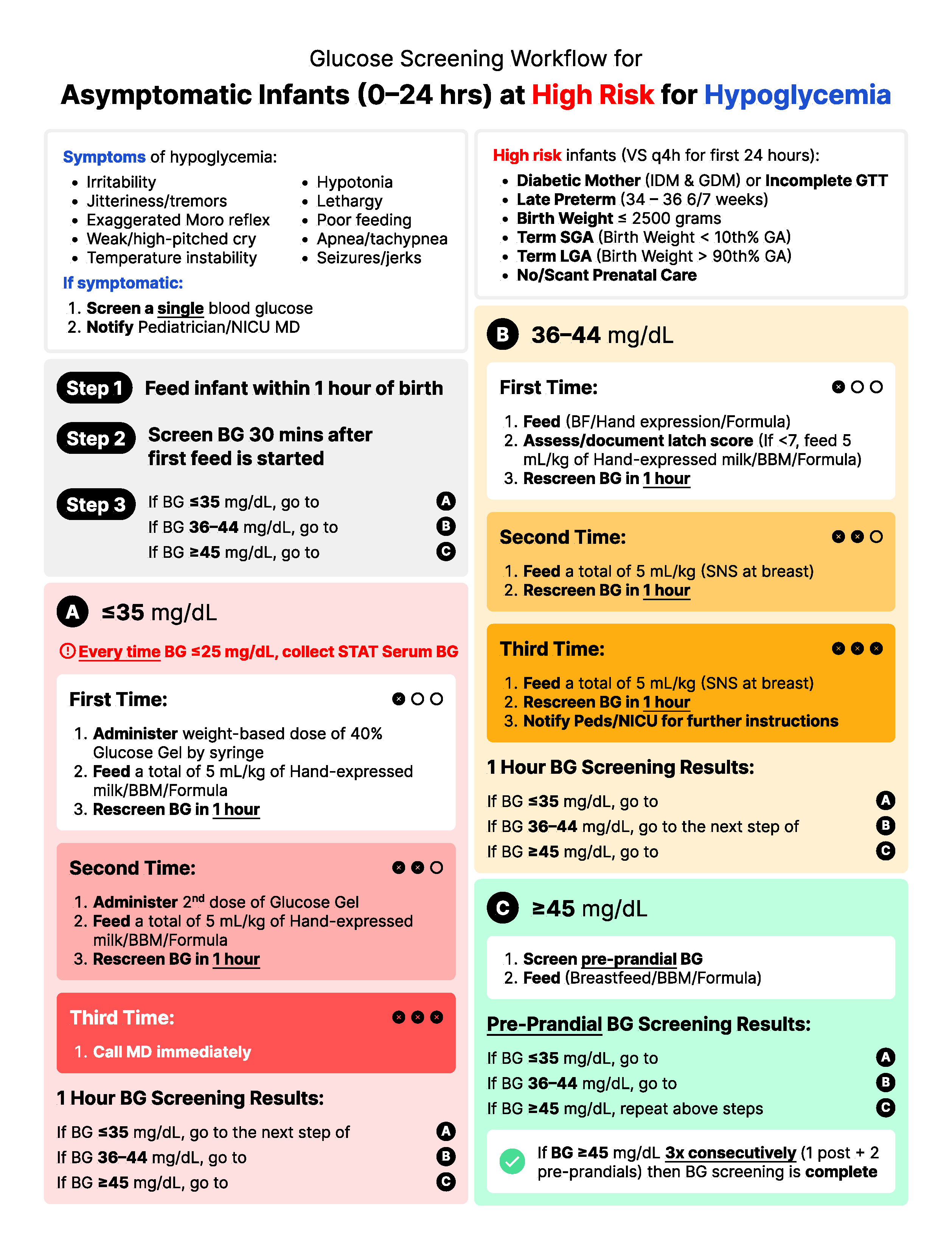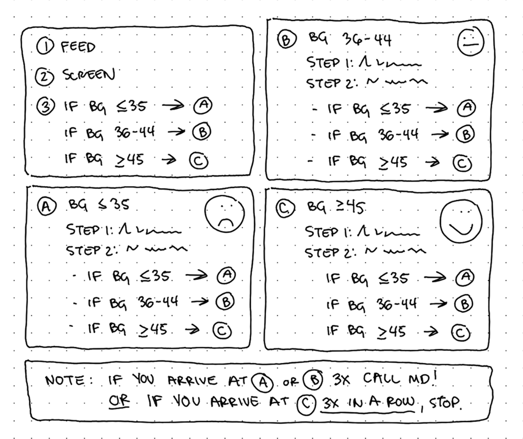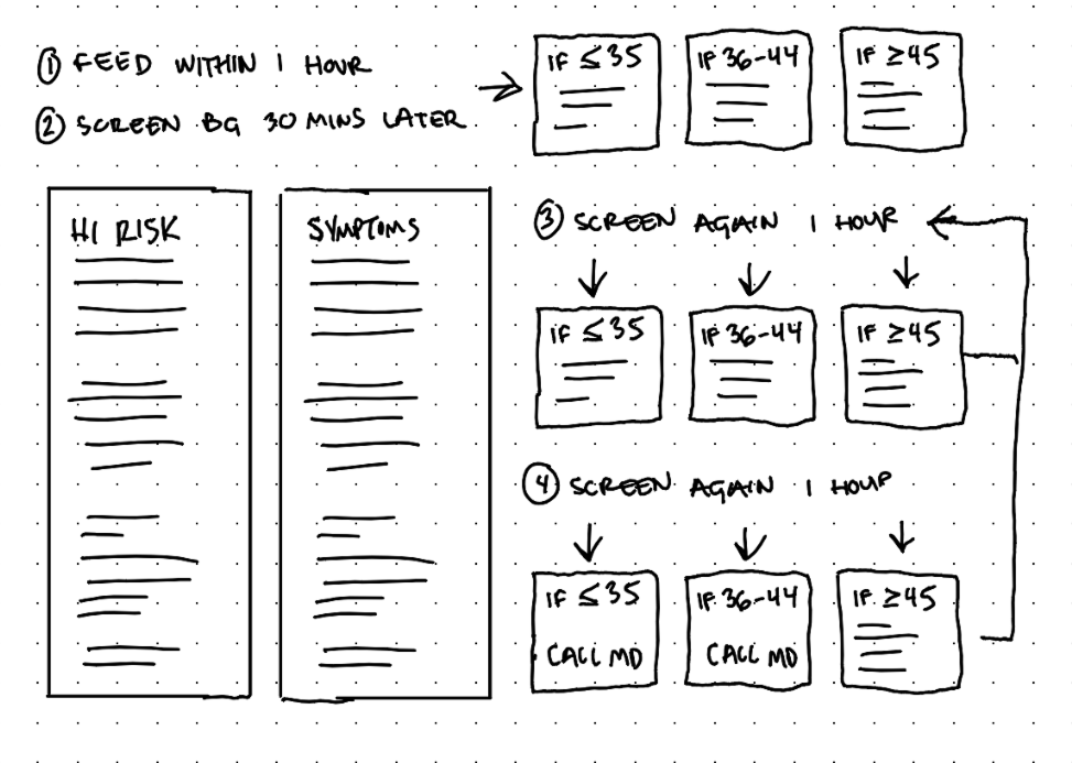 UCI Medical Center in Orange, CA has a high-risk labor and delivery floor designed to care for mothers and babies with rare or difficult pregnancy/birthing complications. They approached me to help them redesign their hypoglycemia (low blood glucose) screening workflow. This workflow is essentially a shorthand reference to their longer nursing policy on testing infants' blood glucose.